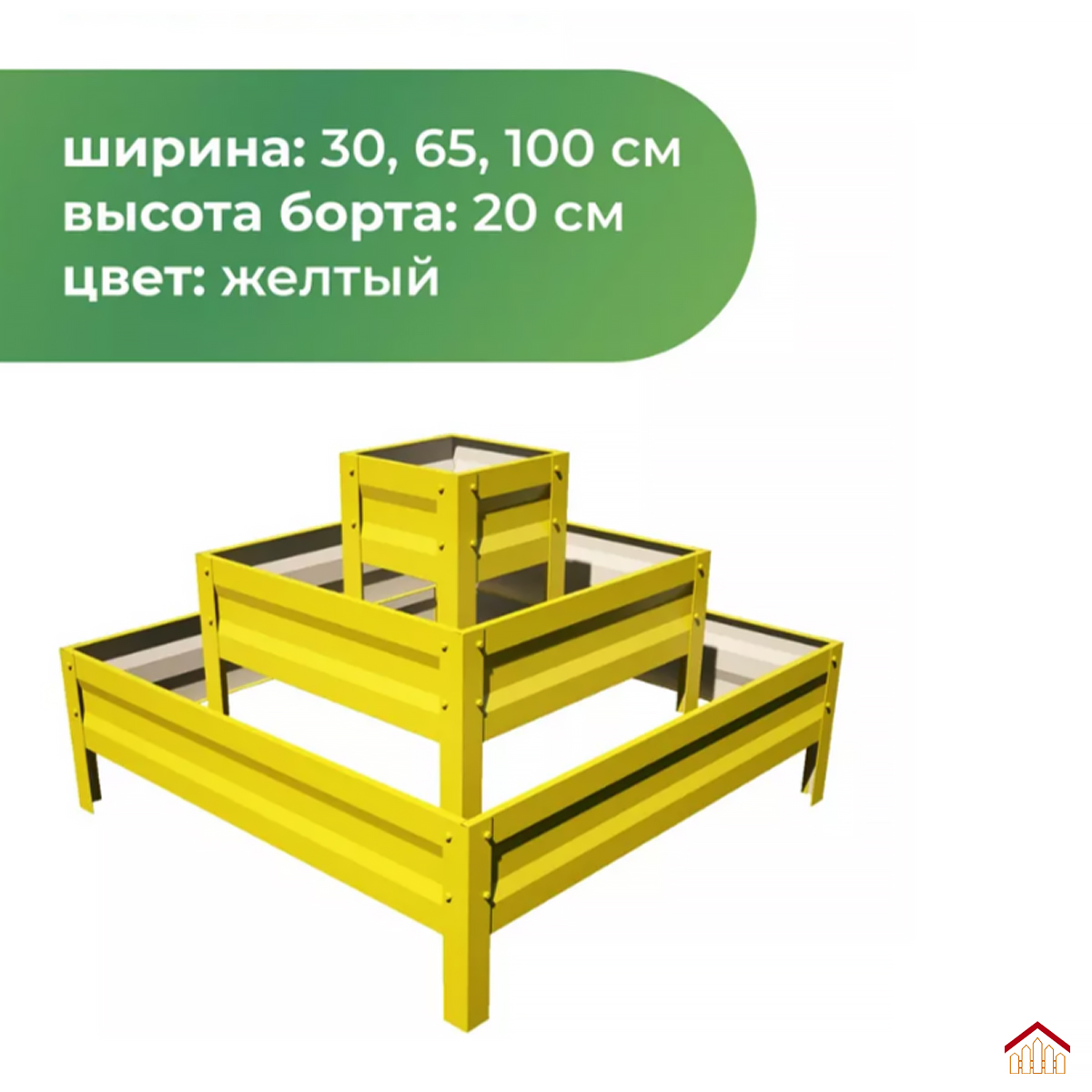 Эта трехъярусная квадратная клумба станет отличным дополнением вашего сада или дачного участка. Изготовленная из высококачественных материалов, она обладает высокой прочностью и долговечностью. Клумба имеет размеры: нижний ярус 1,0м*1,0м, средний ярус 0,65м*0,65м, верхний ярус 0,3м*0,3м и окрашена в цвет RAL1018 желтый, что придает ей элегантный и современный вид. Высота каждого борта 20 см. Благодаря своей конструкции, клумба позволяет создавать красивые многоуровневые композиции из растений. Она идеально подходит для выращивания цветов, овощей или декоративных растений. Клумба легко собирается и не требует специальных инструментов. Ее можно разместить как на открытом воздухе, так и в помещении. Эта клумба станет не только украшением вашего сада, но и практичным решением для организации пространства. Она поможет вам создать уютную и гармоничную атмосферу на вашем участке.