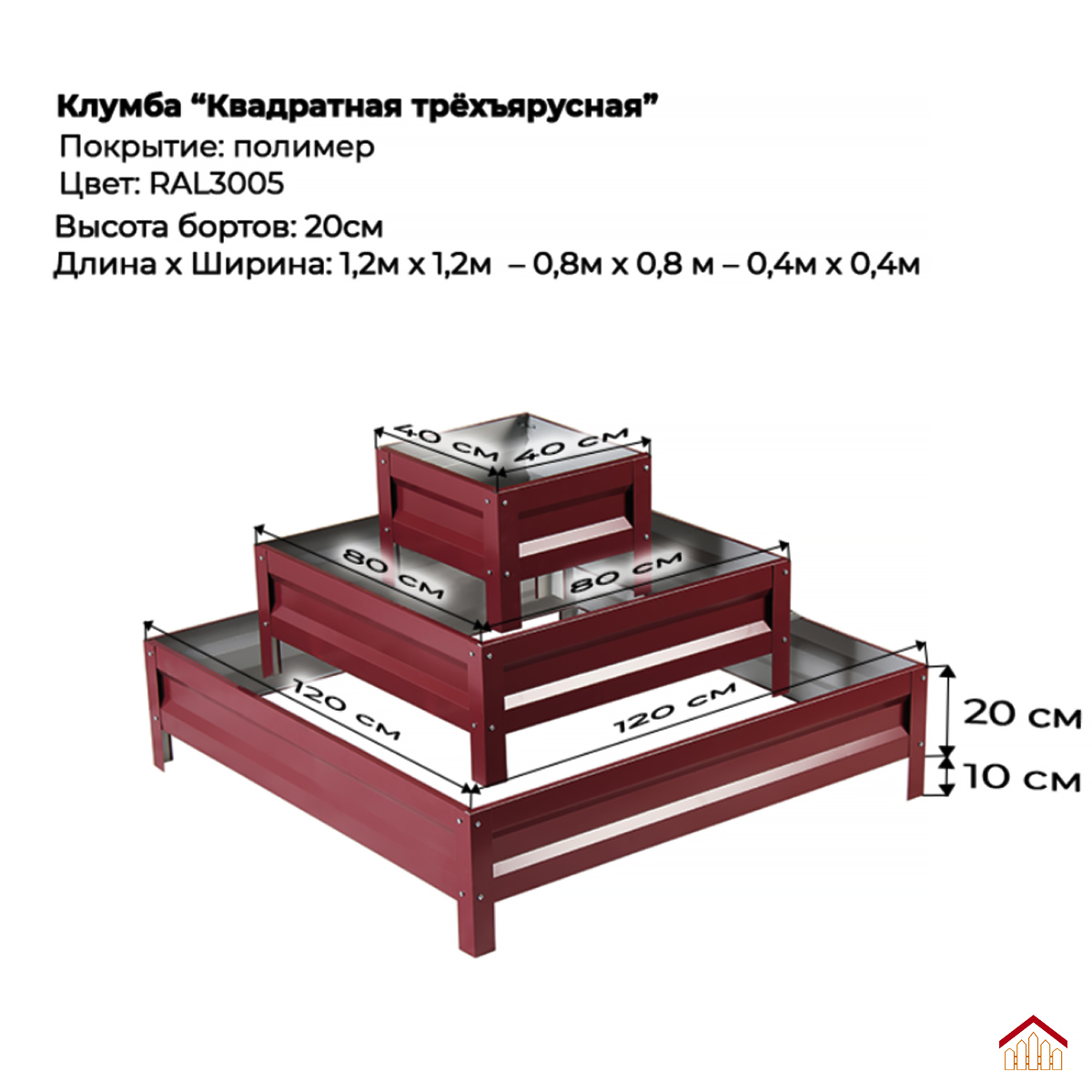 Эта трехъярусная квадратная клумба станет отличным дополнением вашего сада или дачного участка. Изготовленная из высококачественных материалов, она обладает высокой прочностью и долговечностью. Клумба имеет размеры: нижний ярус 1,2м*1,2м, средний ярус 0,8м*0,8м, верхний ярус 0,4м*0,4м и окрашена в цвет RAL3005 красное вино, что придает ей элегантный и современный вид. Высота каждого борта 20 см. Благодаря своей конструкции, клумба позволяет создавать красивые многоуровневые композиции из растений. Она идеально подходит для выращивания цветов, овощей или декоративных растений. Клумба легко собирается и не требует специальных инструментов. Ее можно разместить как на открытом воздухе, так и в помещении. Эта клумба станет не только украшением вашего сада, но и практичным решением для организации пространства. Она поможет вам создать уютную и гармоничную атмосферу на вашем участке.