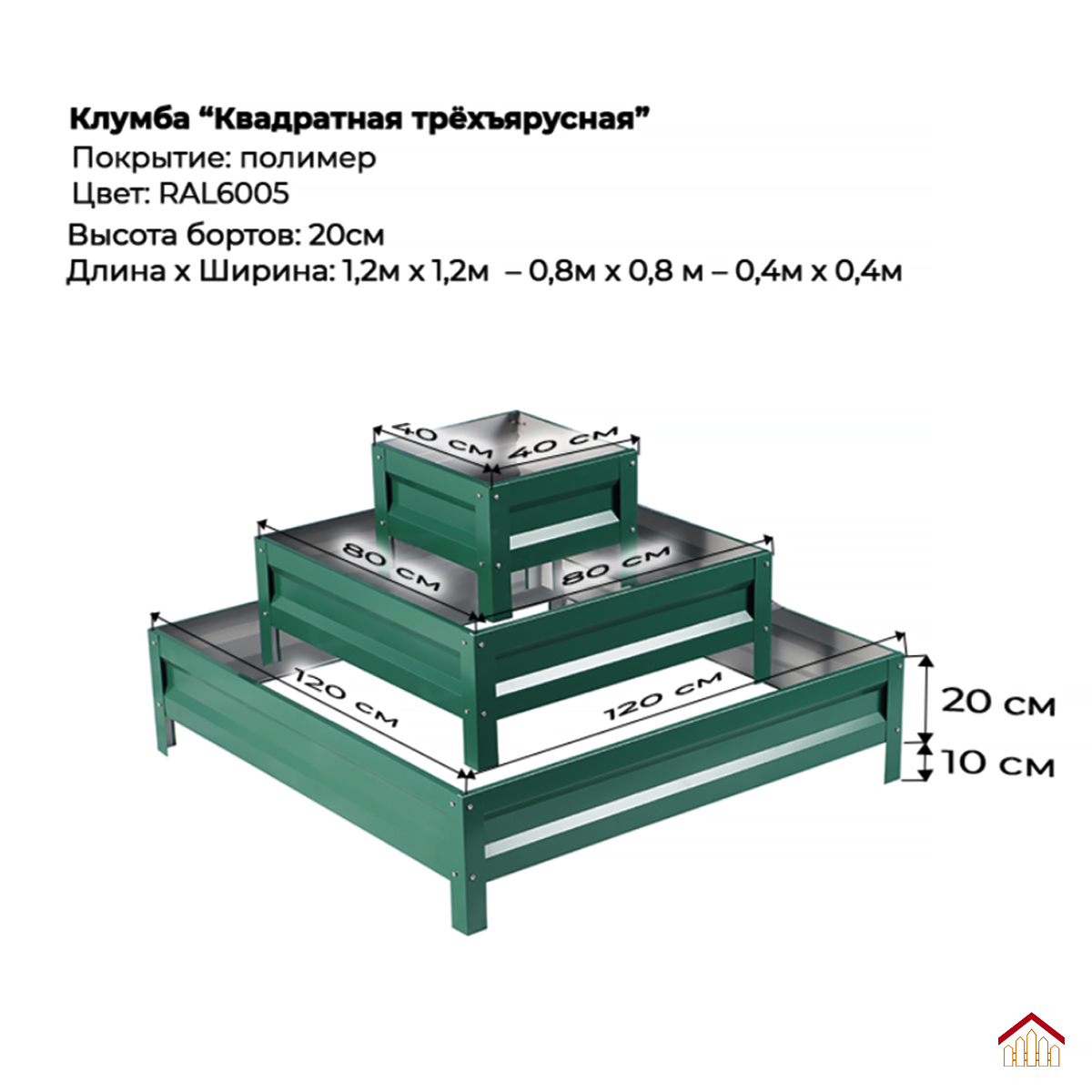 Эта трехъярусная квадратная клумба станет отличным дополнением вашего сада или дачного участка. Изготовленная из высококачественных материалов, она обладает высокой прочностью и долговечностью. Клумба имеет размеры: нижний ярус 1,2м*1,2м, средний ярус 0,8м*0,8м, верхний ярус 0,4м*0,4м и окрашена в цвет RAL6005 зелёный мох, что придает ей элегантный и современный вид. Высота каждого борта 20 см. Благодаря своей конструкции, клумба позволяет создавать красивые многоуровневые композиции из растений. Она идеально подходит для выращивания цветов, овощей или декоративных растений. Клумба легко собирается и не требует специальных инструментов. Ее можно разместить как на открытом воздухе, так и в помещении. Эта клумба станет не только украшением вашего сада, но и практичным решением для организации пространства. Она поможет вам создать уютную и гармоничную атмосферу на вашем участке.