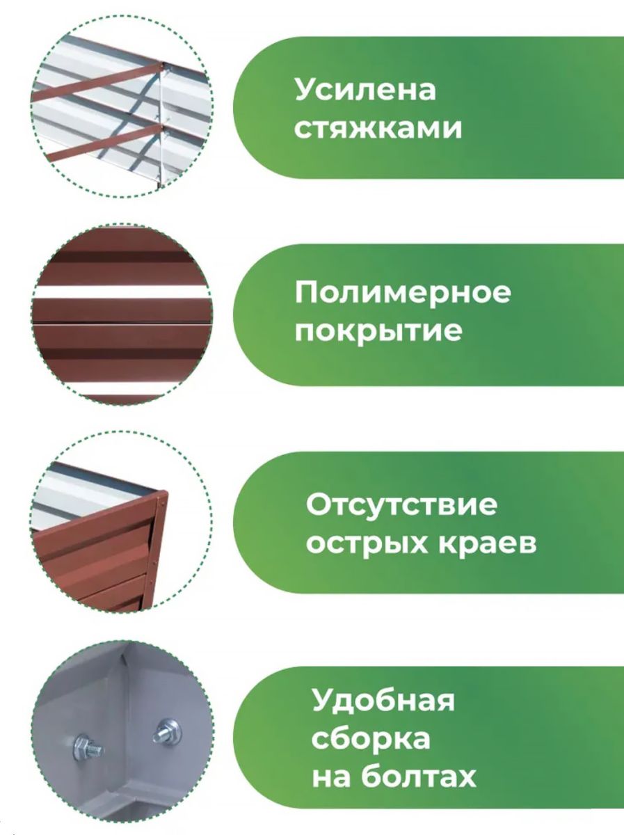Эта прочная и стильная грядка станет отличным дополнением вашего сада или огорода. Изготовленная из высококачественных материалов, она обеспечит вашим растениям идеальные условия для роста и развития. Грядка имеет размеры 1,0*3,0 метра и высоту 40 см, что позволяет эффективно использовать пространство и создавать комфортные условия для выращивания различных культур. Цвет RAL8017 шоколад придаст вашему саду элегантный и современный вид. Конструкция грядки разработана с учетом всех потребностей растений, обеспечивая хорошую вентиляцию и дренаж. Это поможет предотвратить переувлажнение почвы и развитие болезней. Грядка легко устанавливается и не требует специальных инструментов, что делает ее удобной в использовании даже для начинающих садоводов. Благодаря своей прочности и долговечности, эта грядка прослужит вам долгие годы, сохраняя свой первоначальный вид и функциональность. Она идеально подходит для выращивания овощей, фруктов, цветов и других растений. С этой грядкой вы сможете создать красивый и продуктивный сад, который будет радовать вас своим урожаем и эстетичным видом.